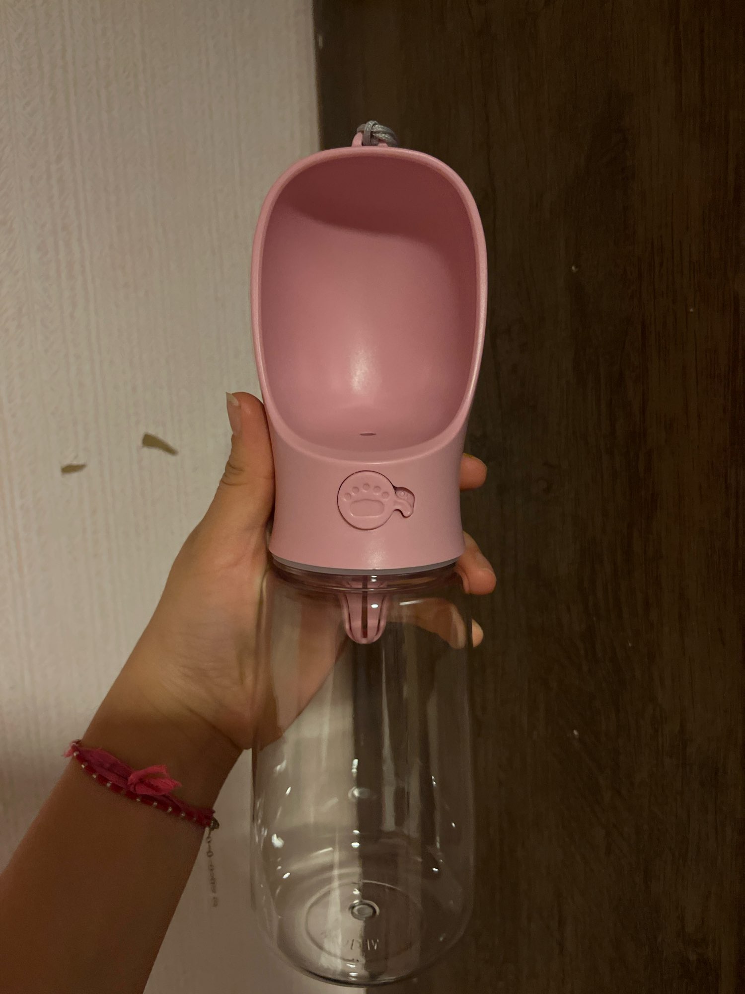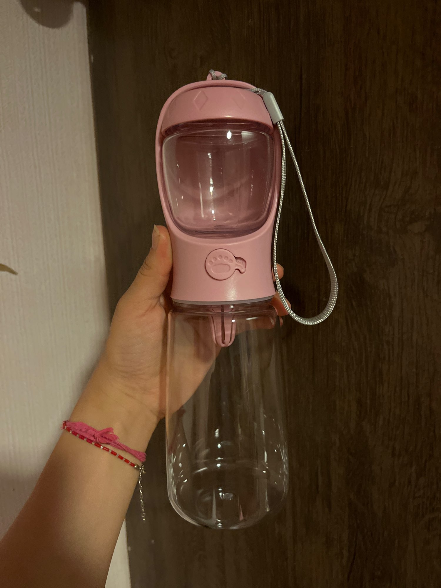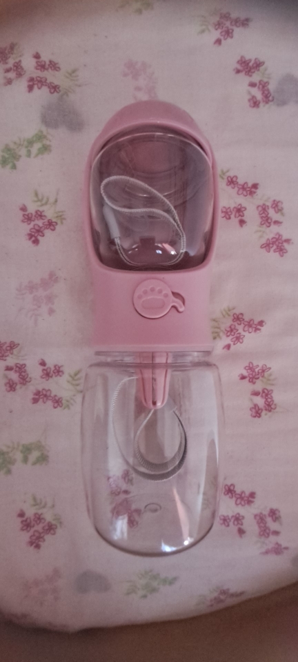 The portable pet water bottle is practical and convenient for walks and travel. The design allows easy access to both water and food, making it a useful item for pet owners. The material feels sturdy, and there are no leaks. The size is suitable for small to medium-sized pets. Overall, a handy product for on-the-go hydration and feeding.